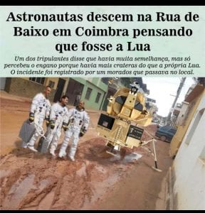 Circula nas redes sociais uma montagem, onde mostra uma rua lameada em Coimbra. No meme, aparece um título, representando a manchete de um jornal, onde fica exposto o seguinte título