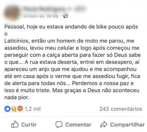 Na noite de domingo, dia 07/04, às 19h06, uma jovem postou um relato em um grupo de grande repercussão no Facebook, narrando que ela havia sido roubada e assediada no