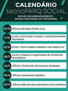 O Nudese Tecnoparq (Núcleo de Desenvolvimento Social e Educacional do Tecnoparq) está realizando diversos cursos gratuitos. Confira os cursos: 04/10: Oficina – Bordado ponto cruz. 11/10: Curso – Como lavar