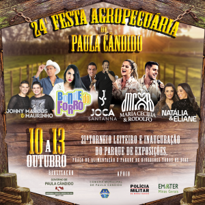 A 24ª Festa Agropecuária de Paula Cândido terá quatro dias de festa, com grandes nomes do cenário nacional como Bonde do Forró, que em sua formação traz o conhecido Lauro