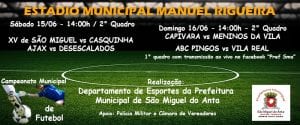 Neste fim de semana, aconteceu em São Miguel do Anta, duas partidas do Campeonato Municipal de Futebol de São Miguel do Anta. Amanhã, sábado, dia 15 de junho, a partir