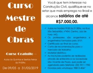 ACONTECERÁ CURSO GRATUITO PARA MESTRE DE OBRAS EM JUIZ DE FORA