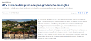 O oferecimento pela UFV de disciplinas de pós-graduação em inglês foi abordado na coluna Boas Práticas do Portal da Capes. A reportagem contextualiza o início da oferta dessas disciplinas e traz os números e