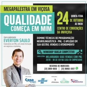 No dia 24 de outubro, às 19h30, será realizado no Centro de Convenções da Univiçosaem Viçosa, a megapalestra “Qualidade começa em mim”. A palestra será ministrada por Everton Saulo, especialista