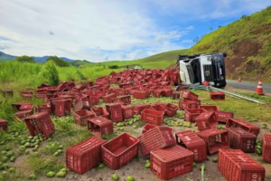 Um caminhão tombou e espalhou carga de manga no acostamento da BR-116, em Muriaé, na terça-feira (13). O acidente aconteceu no trecho conhecido como “Curva de Itamuri”, local com alto índice de ocorrências.