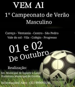 Será realizado em Ervália, nos dias 1 e 2 de outubro, o 1º Campeonato de Verão Masculino no Ginásio Poliesportivo Edward de Freitas Rezende (conhecido como Timbucão), no bairro Vale