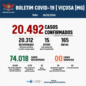 De acordo com os dados do 784º Boletim Epidemiológico de Covid-19, divulgados nesta terça-feira, 06, relativos ao período de 29 de janeiro a 04 de fevereiro de 2024, foram realizados