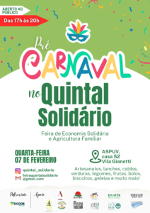 Nesta quarta-feira (7), o projeto de extensão Feira de Economia Solidária e Agricultura Familiar – Quintal Solidário promoverá um pré-carnaval. Entre 17h e 20h, haverá marchinhas de carnaval, espaço de troca e