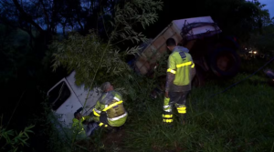 Uma carreta capotou e caiu em uma ribanceira na noite de terça-feira (26) na BR-040, entre Ewbank da Câmara e Santos Dumont. O motorista do veículo não ficou ferido e