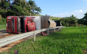 BR-116: carreta carregada com carvão vegetal invade contramão e tomba