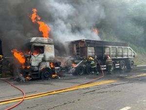 A cabine de uma carreta de minério foi totalmente tomada pelo fogo na manhã desta quinta-feira (30) no km 697 da BR-116, em Muriaé. Segundo relato do motorista, as chamas