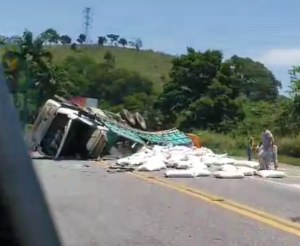 Carreta carregada com fubá fica com as rodas para cima após tombar na BR-040