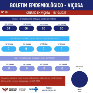 A situação epidemiológica em Viçosa, de acordo com a última atualização da Secretaria Municipal de Saúde, mostra um cenário controlado em relação à dengue, chikungunya e zika. Nas últimas quatro
