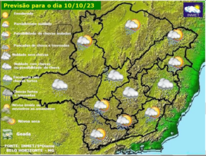 Por todo o estado de Minas Gerais, o tempo é marcado por nebulosidade e possibilidade de pancadas de chuvas isoladas. Na Zona da Mata, o céu fica nublado a parcialmente