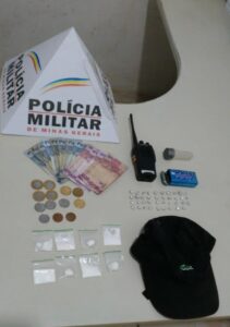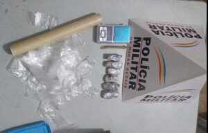 Na abordagem, os policiais encontraram drogas e matérias ilícitos com o suspeito e no local onde ele foi abordado. Um homem foi preso por tráfico de drogas na noite da