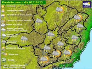 Nesta segunda, a intensificação de uma área de baixa pressão atmosférica sobre o litoral da região Sudeste do Brasil favorece o desenvolvimento de áreas de instabilidade atmosféricas em Minas Gerais.