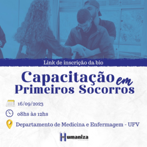 A Humaniza, empresa júnior de Enfermagem da UFV, oferecerá, no próximo sábado (16), a Capacitação de Primeiros Socorros no campus Viçosa. A atividade será realizada, presencialmente, das 8h às 12h,
