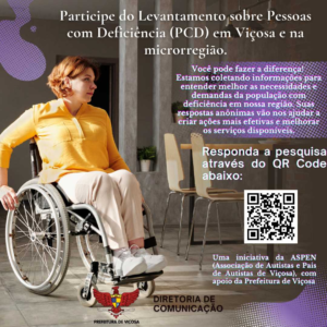 A Prefeitura de Viçosa divulgou, através de seu canal de comunicação, um convite para um levantamento sobre Pessoas com Deficiência (PCD) em Viçosa e na microrregião. Confira na íntegra abaixo: