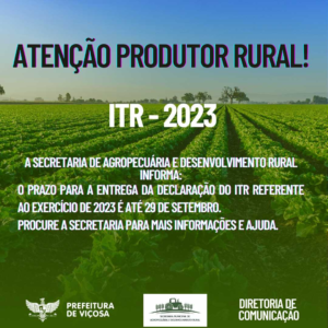 O ITR (Imposto sobre a Propriedade Territorial Rural) 2023 teve seu prazo definido pela Secretaria Municipal de Agropecuária e Desenvolvimento Rural A Prefeitura de Viçosa, através da Secretaria Municipal de
