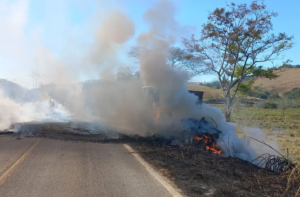MG-133: carreta com móveis pega fogo e interdita via