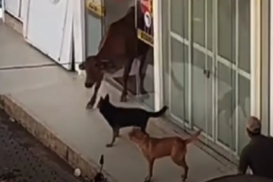 Região: vaca invade autoescola e é retirada com corda