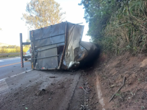 Uma carreta tombou na manhã desta terça-feira (11) na BR-040, em Santos Dumont. O veículo transportava tubos de ensaio, um recipiente usado para efetuar reações químicas de pequena escala. De acordo com a