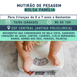 Mutirão ocorrerá na ESF Central no próximo sábado, 15, e será feito com famílias beneficiárias do progama Bolsa Família. A Prefeitura de Viçosa, através da Secretaria Municipal de Saúde, vai