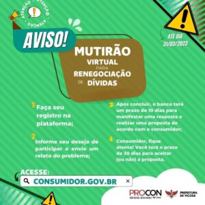 A fim de auxiliar os consumidores, o PROCON de Viçosa, órgão ligado à Secretaria Municipal de Fazenda, disponibiliza algumas orientações acerca do Mutirão On-line de Renegociação de Dívidas, que acontece até