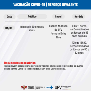 Será aplicada a vacina Bivalente, em esquema de Drive Thru, a partir das 8h, no Espaço Multiuso da UFV. A Prefeitura de Viçosa vai iniciar, neste sábado, 04 de março,