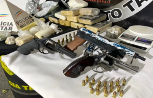 Além deste material, dois revólveres foram encontrados. Uma mulher foi presa. Dez quilos de cocaína com logo de uma rede social foram apreendidos em um apartamento no Centro de Muriaé. A