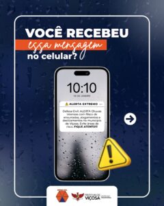 Nova ferramenta de alertas via celular é direta, sem necessidade de Cadastro. “Alerta severo…Defesa Civil: alerta de chuvas intensas com risco de enxurradas, alagamentos e deslizamentos no Município de Viçosa.