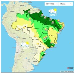 Nesta terça-feira, as condições meteorológicas são favoráveis ao tempo instável e há previsão de pancadas de chuva típicas da estação da Primavera em grande parte do estado de Minas Gerais.