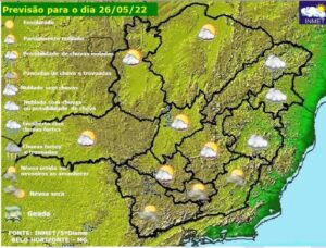 Nesta quinta-feira (26/5), o estado deve ter céu nublado a parcialmente nublado com possibilidade de chuva fraca e isolada no Rio Doce, Mucuri e Jequitinhonha. Já no Sul/Sudoeste, Campo das