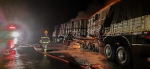 Carreta pega fogo na rodovia que liga Ponte Nova a Teixeiras