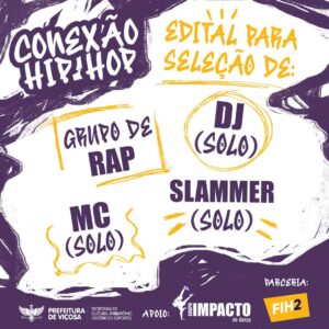 Edital selecionará um Grupo de RAP, um DJ, um MC e um Slammer para participarem do evento Visando contextualizar o evento Conexão Hip Hop com a linguagem artístico-cultural do Movimento
