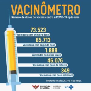 O Setor de Atenção Primária em Imunizações, da Secretaria Municipal de Saúde, atualiza os dados da vacinação contra a Covid-19, referentes aos dias 29, 30 e 31 de março. Em