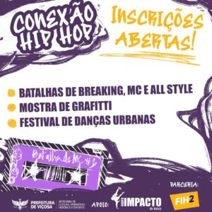 A Secretaria de Cultura, Patrimônio Histórico e Esportes abre inscrições para atividades do 8º Conexão Hip Hop. O evento celebra o Movimento Hip Hop de Viçosa e, nesta edição, é