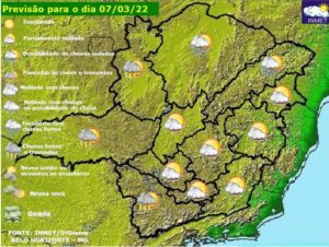 Nesta segunda-feira (7/3), a previsão do tempo é de céu claro a parcialmente nublado com pancadas de chuva e trovoadas isoladas no Noroeste, Triângulo Mineiro/Alto Paranaíba e Sul/Sudoeste. Possibilidade de