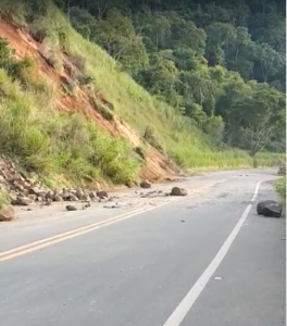 Uma grande quantidade de pedras se desprendeu de um barrando e deslizou até a rodovia na Serra de São Geraldo, no sentido a Coimbra. Motoristas que passavam pelo local tinham