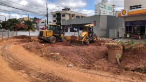 O fechamento do buraco da praça Mário del Giudice teve início na manhã desta quarta-feira (26). Com dois tratores, a movimentação da terra estava sendo feita no local para a