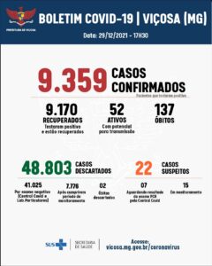 A Vigilância Epidemiológica de Viçosa confirmou 23 novos casos de Covid-19, no boletim desta quarta-feira, 29. O município contabiliza agora 9.359 confirmações, sendo que 9.170 pessoas já estão recuperadas da