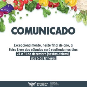 A Secretaria Municipal de Agropecuária e Desenvolvimento Rural informa que, excepcionalmente, neste final de ano a Feira Livre dos sábados será realizada nos dias 24 e 31 de dezembro (sextas-feiras),