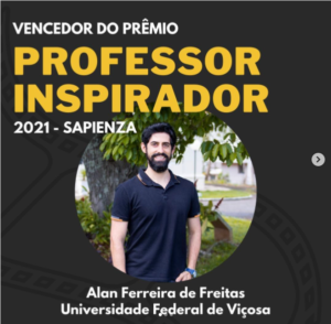 O professor da Universidade Federal de Viçosa (UFV), Alan Ferreira de Freitas, venceu o prêmio ‘Professor Inspirador 2021’, do Instituto Sapienza Brasil, com o apoio do SEBRAE/RS. O Prêmio Professor
