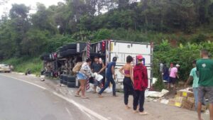 Carreta de cooperativa de Visconde do Rio Branco tomba na BR-116 e carga é saqueada