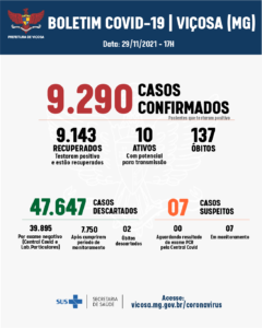 No boletim epidemiológico desta segunda-feira (29) Viçosa registrou três novos casos de Covid-19. Agora, o município contabiliza 9.290 confirmações, sendo que 9.143 pessoas já estão recuperadas da doença. São 10