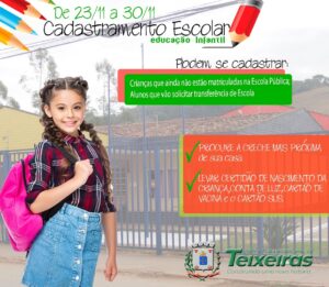 A Prefeitura Municipal de Teixeiras por meio da Secretaria Municipal de Educação, informa que o cadastramento escolar para crianças da educação infantil está sendo realizado desde ontem, terça-feira (23) e