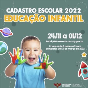 A Prefeitura de Viçosa, por meio da Secretaria Municipal de Educação, informa que a partir desta quarta-feira, 24, estão abertas as inscrições para o Cadastramento Escolar para a Educação Infantil