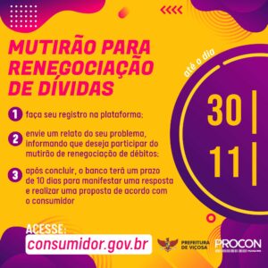 O Procon de Viçosa, órgão ligado à Secretaria Municipal de Fazenda, promove, até o dia 30 de novembro de 2021, um mutirão online de renegociação de dívidas. A iniciativa, que