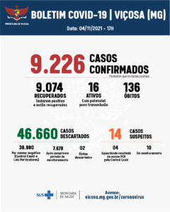 A Vigilância Epidemiológica confirmou mais dois casos de Covid-19, nesta quinta-feira, 04. Agora, Viçosa contabiliza 9.226 confirmações, sendo que 9.074 pessoas já se recuperaram da doença. São 16 casos ativos