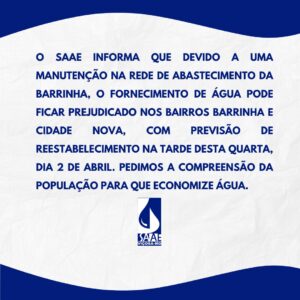 Intervenção na rede da Barrinha exige economia e afeta o fornecimento de água em dois bairros da cidade. O Serviço Autônomo de Água e Esgoto (SAAE) de Viçosa informou que,